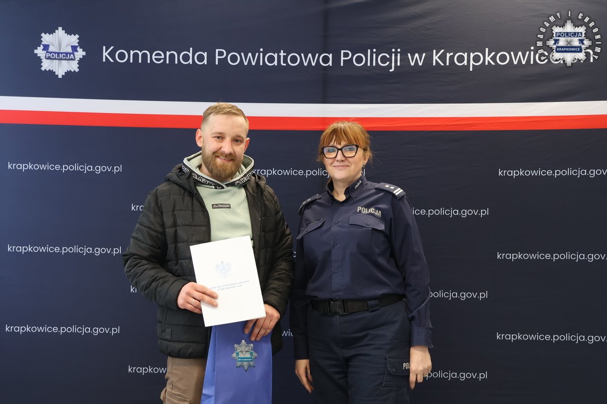 W Komendzie Powiatowej Policji w Krapkowicach odbyło się spotkanie, na które został zaproszony mężczyzna, który ujął nietrzeźwego. Mieszkaniec powiatu krapkowickiego od Kierownicwa tutejszej Jednostki Policji otrzymał list gratulacyjny i drobny upominek za zaangażowanie i godną naśladowania postawę.