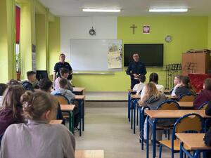 Asp. Alicja Sornat oraz asp. Krzysztof Rejman z Komendy Powiatowej Policji w Krapkowicach przeprowadzili spotkania profilaktyczne z uczniami szkół podstawowych, których celem było zwiększenie świadomości dzieci i młodzieży w zakresie bezpieczeństwa w ruchu drogowym oraz odpowiedzialności prawnej osób nieletnich w zakresie nowelizacji niektórych przepisów o kierowaniu hulajnogą elektryczną.
