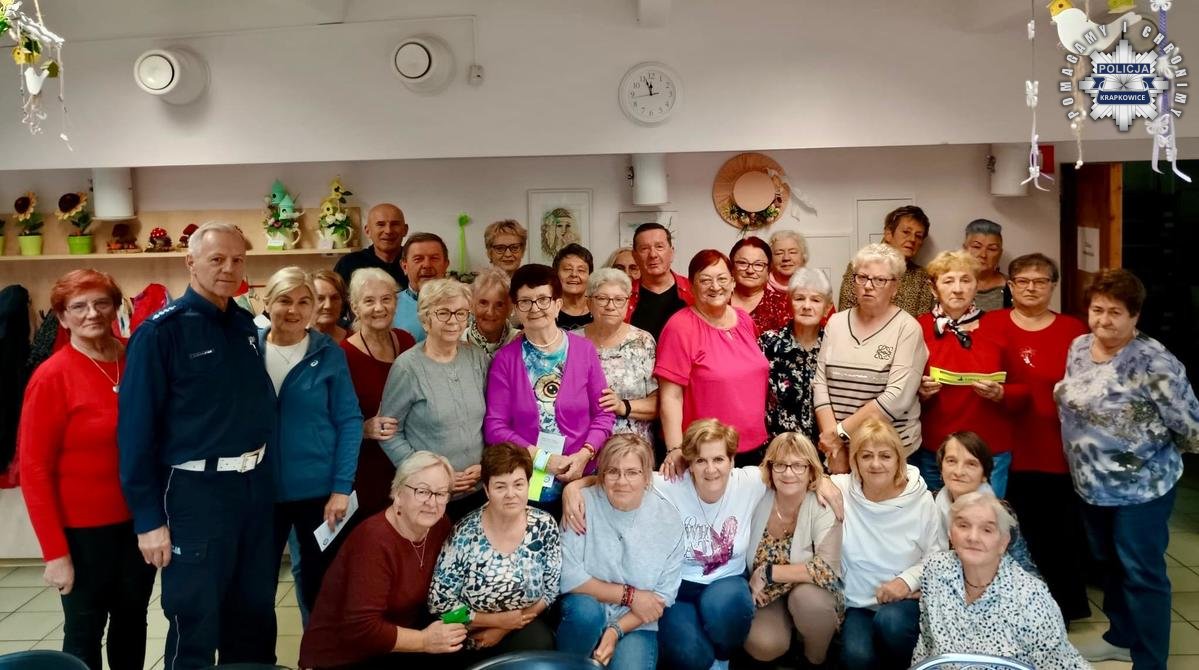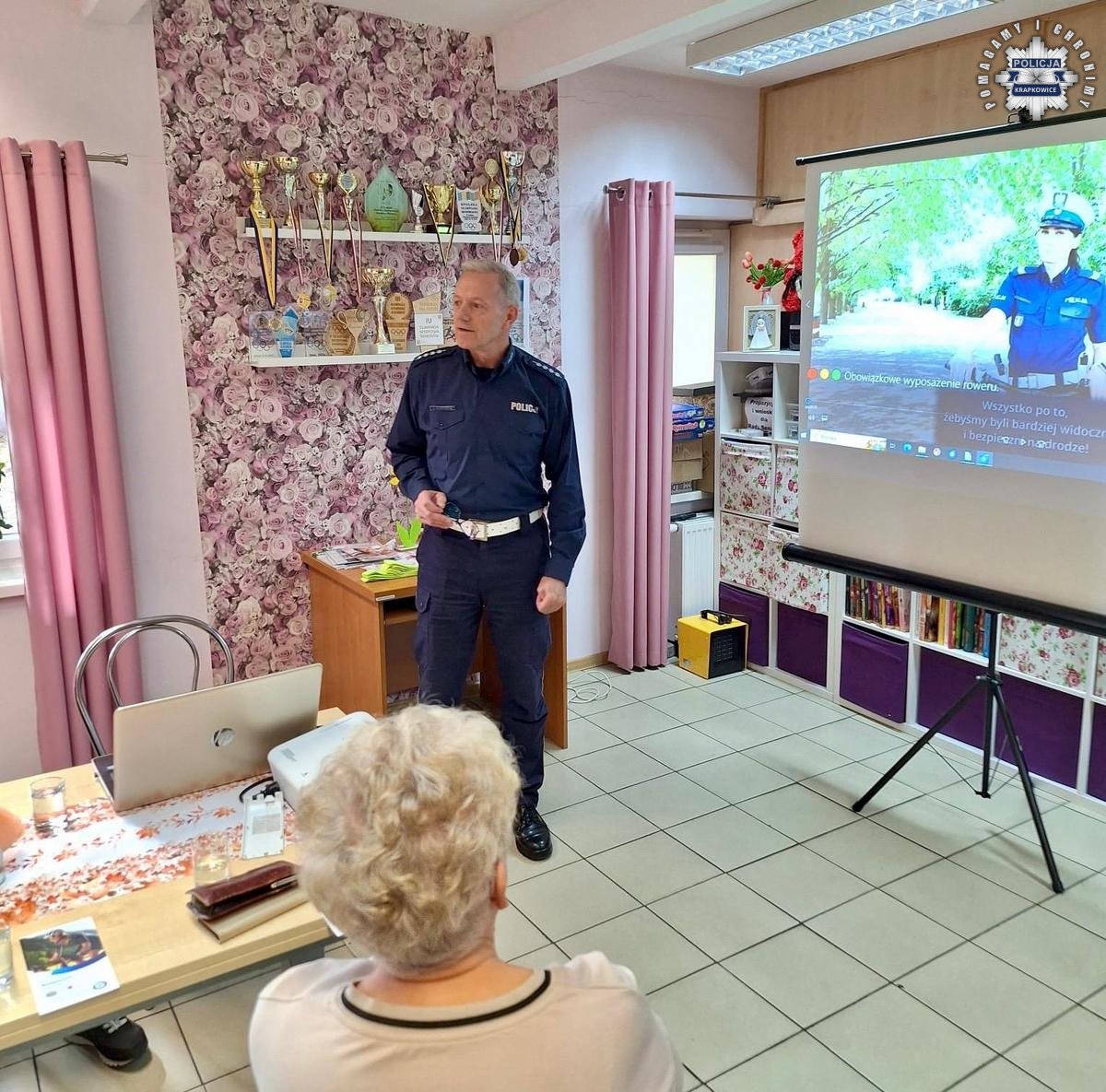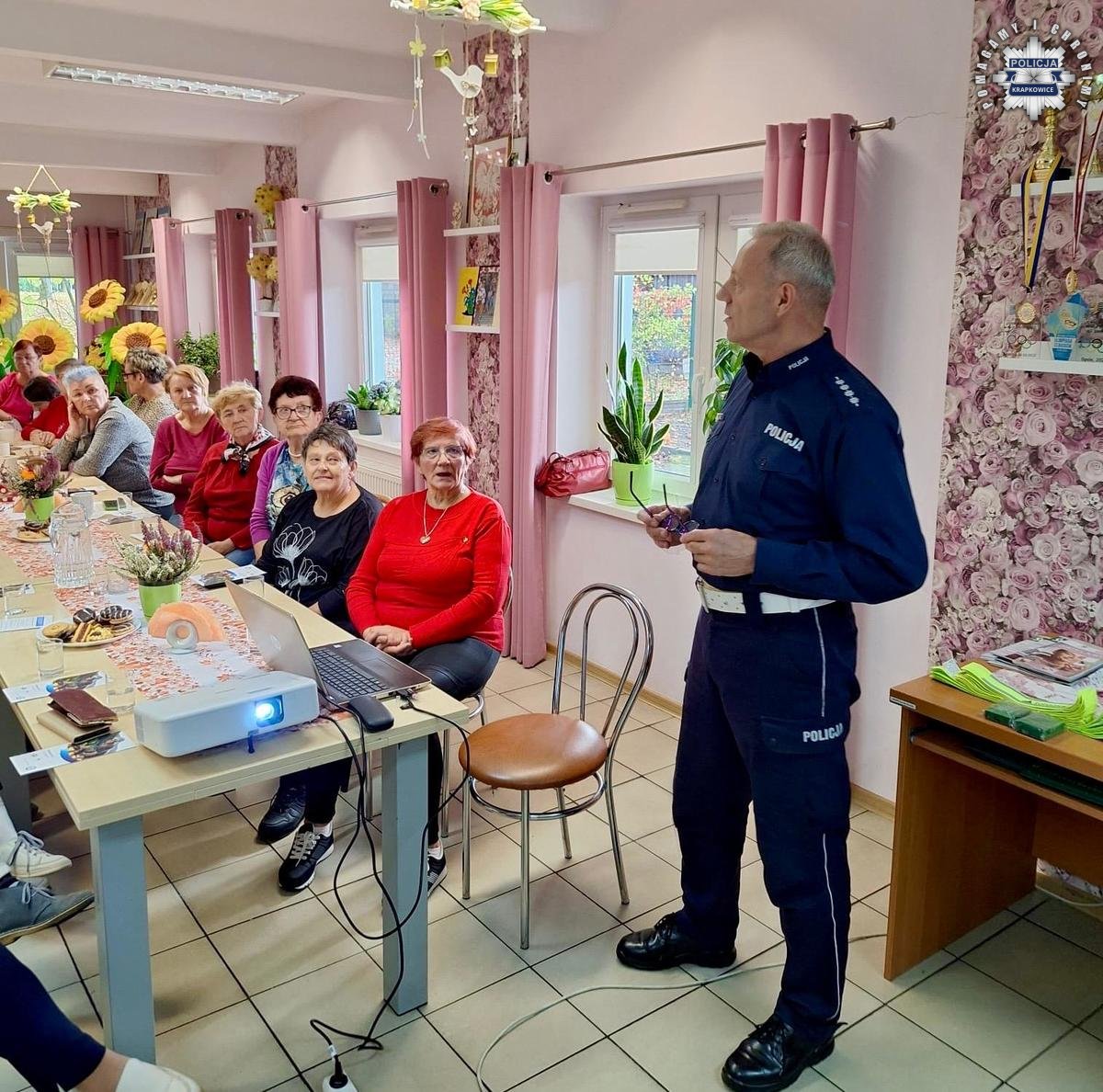 Asp. szt. Eugeniusz Adamkiewicz, naczelnik Wydziału Ruchu Drogowego z krapkowickiej Policji, odwiedził seniorów w domu dziennego pobytu w Zdzieszowicach. W czasie spotkania policjant przypomniał najważniejsze przepisy ruchu drogowego. Dodatkowo w ramach ogólnopolskiej akcji profilaktycznej pn. „Noś odblaski – świeć przykładem”, funkcjonariusz rozdał elementy odblaskowe i przypomniał, jak ważna jest widoczność na drodze – szczególnie po zmroku i w okresie jesienno-zimowym.