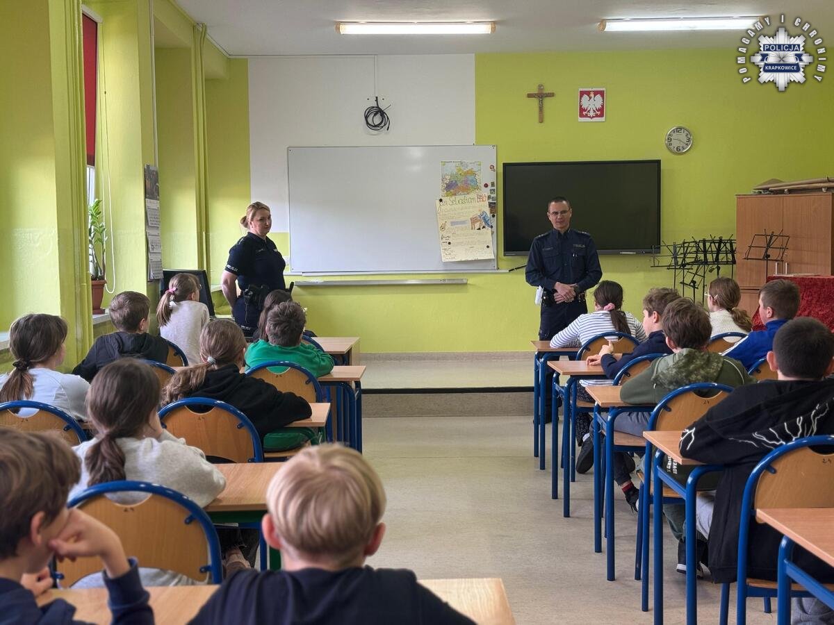 Asp. Alicja Sornat oraz asp. Krzysztof Rejman z Komendy Powiatowej Policji w Krapkowicach przeprowadzili spotkania profilaktyczne z uczniami szkół podstawowych, których celem było zwiększenie świadomości dzieci i młodzieży w zakresie bezpieczeństwa w ruchu drogowym oraz odpowiedzialności prawnej osób nieletnich w zakresie nowelizacji niektórych przepisów o kierowaniu hulajnogą elektryczną.