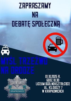 Komendant Powiatowy Policji w Krapkowicach mł. insp. Krzysztof Kociuga, zaprasza wszystkich zainteresowanych mieszkańców Krapkowic i powiatu krapkowickiego do udziału w debacie społecznej. Celem debaty jest uświadomienie jak negatywny wpływ na bezpieczeństwo w ruchu drogowym ma alkohol. Na spotkanie zapraszamy 1 października br., o godz. 10.30 do Liceum Ogólnokształcącego w Krapkowicach przy ul. Ks. Duszy 7